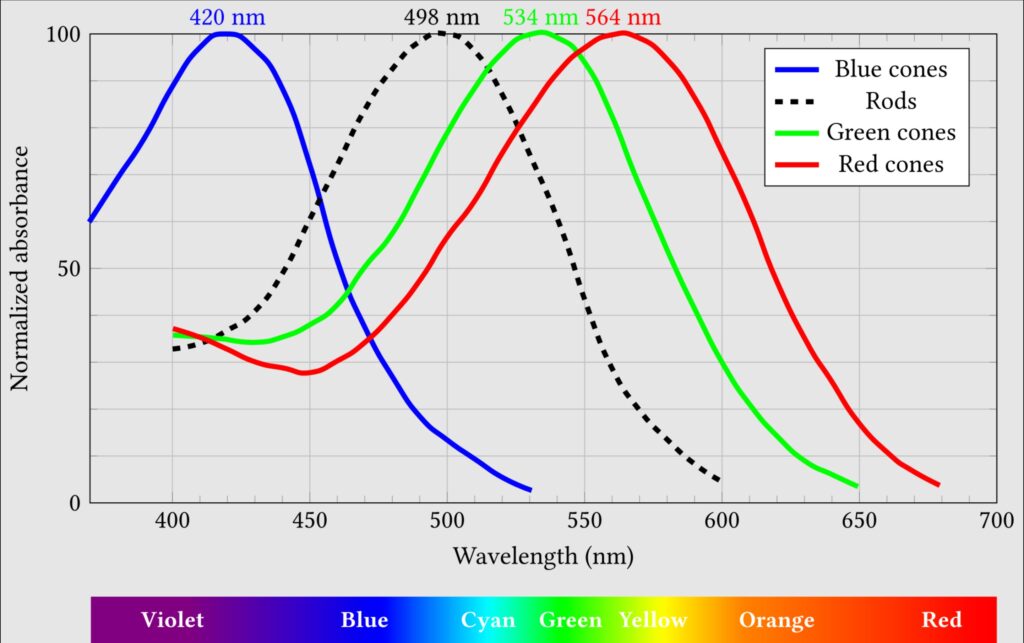 肉眼裏有三種感色的錐狀細胞分別是紅、綠、藍,但它們不是感受到單一波長的純色光,而是一定範圍波長的分佈,大致上的分佈如下圖所示,橫向座標是可見光的波長範圍從380nm~700nm,縱向是強度,三色分別代表三種錐狀細胞: